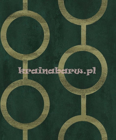 rolka ma długość 10,05m, szerokość 53cm, oraz przesunięcie wzoru co 64cm. Modny geometryczny wzór z motywem połączonych ze sobą dużych kół, obręczy o średnicy 23cm. Wzór umieszczony na prostym, lekko przecieranym tle, przypominającym surową betonową ścianę, tworzy we wnętrzu imponujące wrażenie. Piękny, głęboki odcień malachitowej zieleni z jaśniejszą o metalicznym blasku, daje spektakularny efekt. Doskonałej jakości wyrafinowana tapeta to eleganckie wykończenie salonu, gabinetu, sypialni i innych prestiżowych miejsc.