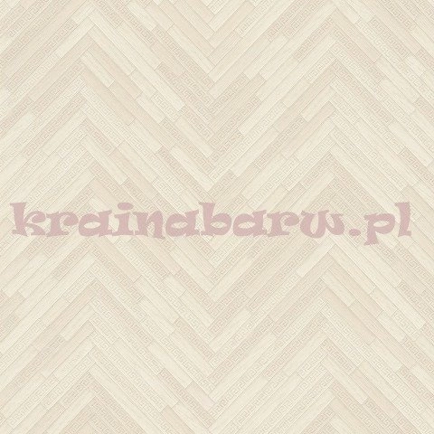 Wysokiej jakości zmywalna tapeta na podłożu flizelinowym, ma szerokość 70cm, długość 10,05 metra, pasowanie wzoru co 64cm. Tapeta w odcieniach jasnego kremu, z wyczuwalną w dotyku strukturą i modnym geometrycznym wzorem w jodełkę, ułożoną z drewnianych klepek przypominających parkiet. Prosty wzór został wzbogacony charakterystycznymi dla Versacego geometrycznymi meandrami. Luksusowa tapeta z dyskretną elegancją ozdobi wnętrza zarówno w stylu nowoczesnym, skandynawskim, jak i rustykalnym, vintage.