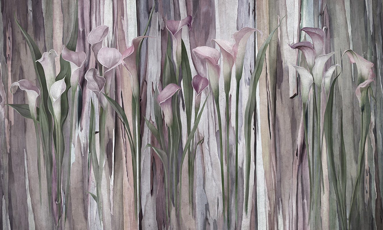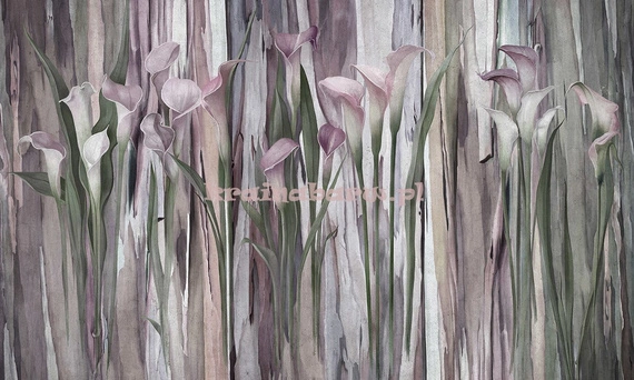 Fototapeta z nowoczesną grafiką, w dotyku lekko chropowata, sprawia wrażenie głębi i przestrzeni tworząc efekt 3D. Zjawiskowe, wysmukłe kwiaty kali w odcieniach fioletowo różowych z szarościami i odrobiną zieleni, tworzą niezwykle elegancki i spektakularny efekt.