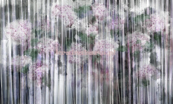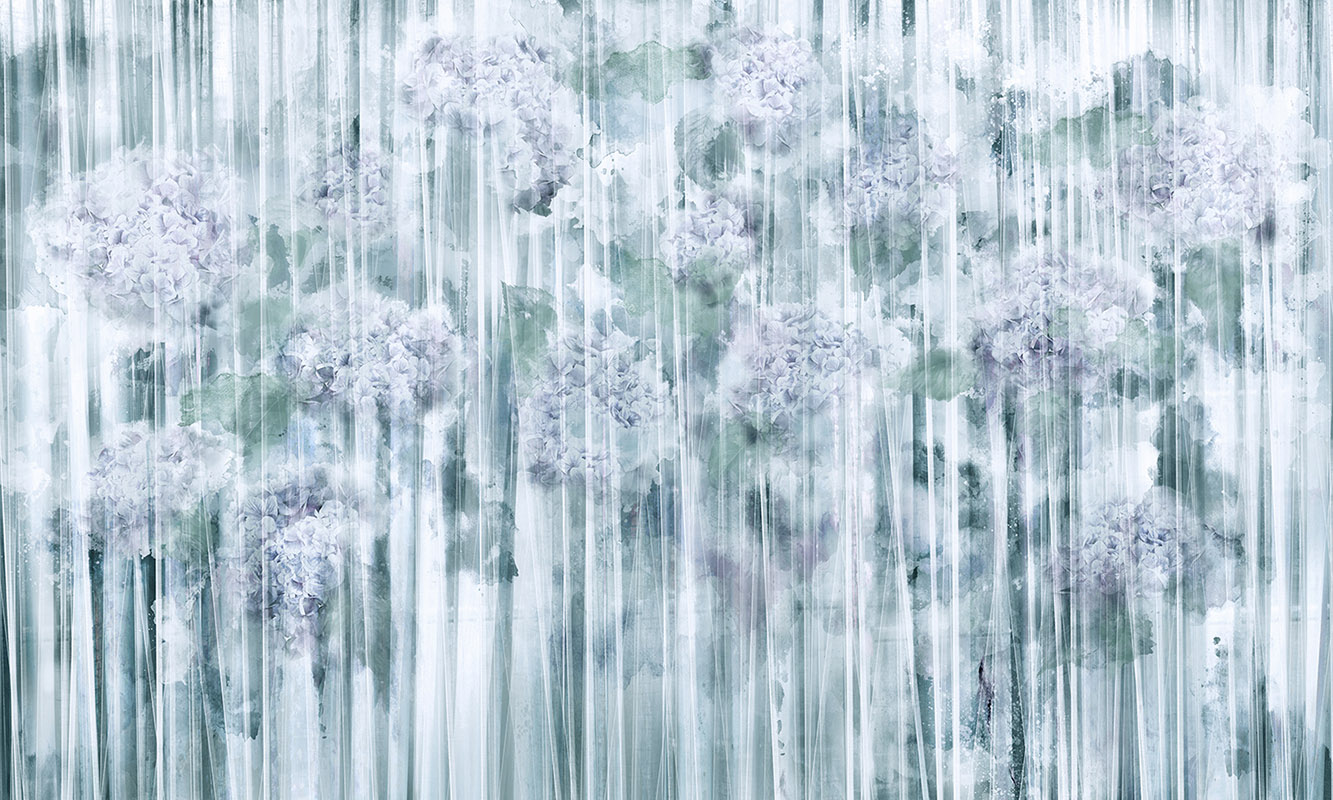 Fototapeta z nowoczesną grafiką, z wyczuwalną strukturą, sprawia wrażenie głębi i przestrzeni tworząc efekt 3D. Piękne, eteryczne kwiaty hortensji za lekką, przymgloną, zwiewną tiulową firanką, sprawiają niezwykłe wrażenie. Delikatne kolory rozbielonych odcieni kolorów fioletowo różowych z szarościami, zielenią, tworzą harmonijną, przyjemną i pełną elegancji atmosferę.