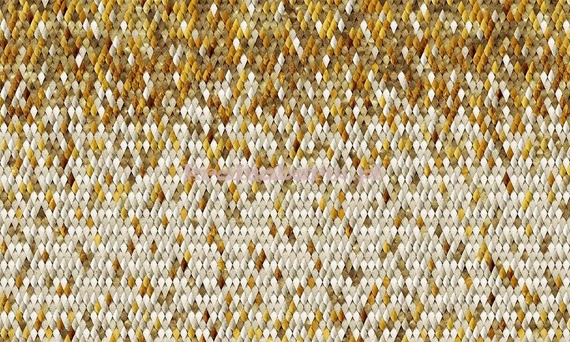 Wysokiej jakości zmywalna fototapeta z geometrycznym wzorem małych rombów, przypominających wełniane sploty, w ciepłych odcieniach złocistych brązów, beży, kremów i lekkich szarości. Fototapeta z nowoczesną grafiką, z wyczuwalną w dotyku strukturą, tworzy na ścianie trójwymiarowy efekt 3D, tworząc przytulną i ciepłą atmosferę.