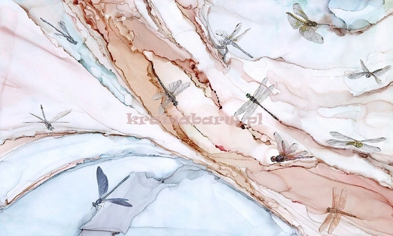 Fototapeta z nowoczesną grafiką, z wyczuwalną w dotyku strukturą, zainspirowana pięknem natury. Wzór przypomina naturalny marmur z widocznymi żyłkami, przenikającymi kolorami, w odcieniach koloru różowego, brązowego, niebieskiego, szarego, na którym wspaniale prezentują się urocze ważki. Doskonałej jakości fototapeta doskonale wpisuje się we współczesne wnętrza, tworząc w nich oryginalny i modny klimat.