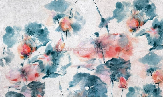 Fototapeta z nowoczesną grafiką, z wyczuwalną w dotyku strukturą, sprawia wrażenie głębi i przestrzeni tworząc efekt 3D. Malownicze, akwarelowe duże kwiaty, liście, w przenikających się, rozmytych odcieniach koloru niebieskiego, różowego, lekkiej czerwieni, szarości, robią niezwykłe wrażenie, z szykiem i elegancją wpisują się w klimat współczesnych wnętrz.