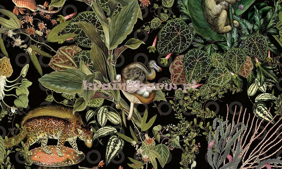 Przyjemna w dotyku miękka, tekstylna tapeta na flizelinie, o szerokości 130cm, sprzedawana jest na pełne metry bieżące. Fantastyczny, drukowany cyfrowo, duży powtarzający się, co 2 mb wzór, tworzy zjawiskowy efekt. Wśród bujnych tropikalnych liści, roślin, ukryte są zwierzęta, które wyginęły: nosorożec karłowaty, dzik pancerny, ptak dodo, kałamarnica parasolowa, latające ryby, leniwiec, zebra kwagga, pławikonik, lampart brodaty. Wspaniałe kolory, mistrzowsko dopracowane szczegóły, tworzą we wnętrzu magiczny, zapadający w pamięć klimat.To spektakularne wykończenie każdego wnętrza.