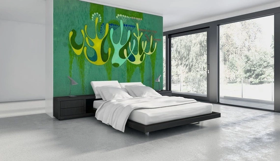 Tapety z kolekcji Czarodziejski Las potrafią zdominować przestrzeń, dlatego polecamy je szczególnie do hoteli czy dużych otwartych biur. Natomiast odpowiednio wyeksponowane w mniejszych wnętrzach przyciągną uwagę, stając się osią dla niebanalnych aranżacji. Choć naturalnie kojarzą się ze stylem boho, harmonijnie wpisują się w nurt nostalgii za czasami PRL-u, trendy futurystyczne a nawet glamour.