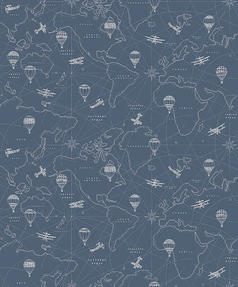 Tapeta na flizelinie ma długość 10,05 m, szerokość 53 cm, pasowanie wzoru co 32 cm. W odcieniach granatu i bieli przedstawiono mapę świata wraz z różą wiatrów, samolotami i balonami. Jest dostępna w dwóch wariantach kolorystycznych.