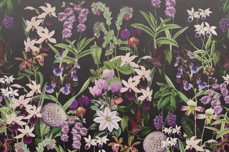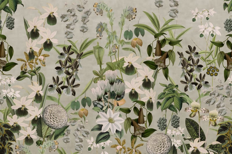 Alicja w krainie czarów została wydana po raz pierwszy w 1865 roku i od tego czasu została przetłumaczona na 125 języków oraz zilustrowana przez ponad 200 artystów. Wciąż inspiruje nas odwrócona perspektywa widoków, ciał i rzeczy, które naprzemiennie są minimalizowane lub maksymalizowane. Zwiększając rozmiar kwiatów, łatwiej jest zobaczyć i w pełni uchwycić każdy najdrobniejszy szczegół naszej flory i fauny. W tym wzorze można znaleźć takie kwiaty, jak storczyki, cyklameny, cynie i powojniki.