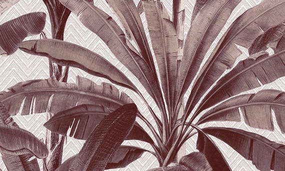 Przyjemna w dotyku miękka, tekstylna tapeta na flizelinie, o szerokości 70 cm, długości 8,50 m z przesunięciem wzoru co 140/ 70 cm. Przedstawia ciemne, brudno różowe liście tropikalnej palmy, na jasnym beżowym tle, przypominającym tkaninę. Tapeta ma matowe wykończenie i jest dostępna w dwóch wariantach kolorystycznych.