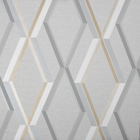 Rolka ma szerokość 53cm, długość 10,05 metra, pasowanie wzoru co 64cm. Piękny geometryczny wzór w duże romby o wielkości 18cm x 30cm w odcieniach modnej szarości. Prosty wyrazisty wzór z metalicznym akcentem idealnie wpisuje się do współczesnych wnętrz: salonów, sypialni, jadalni, gabinetów, przedpokojów, holi.
