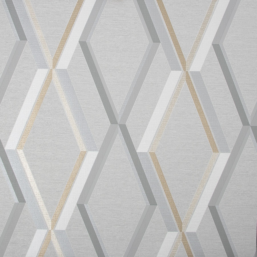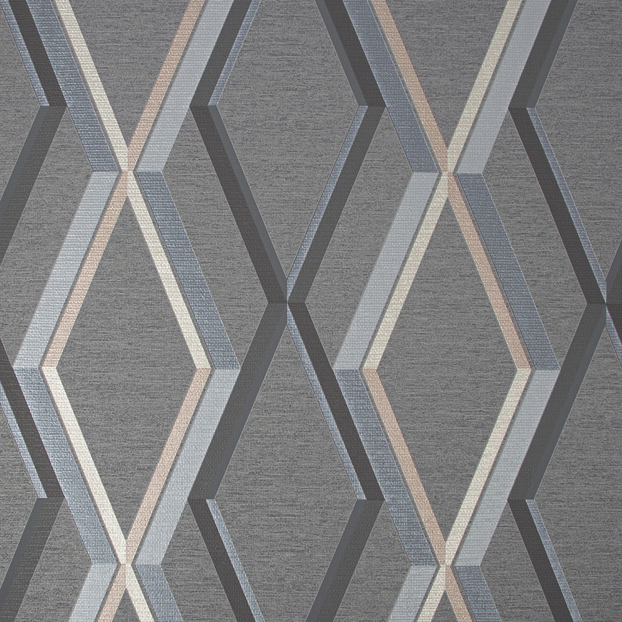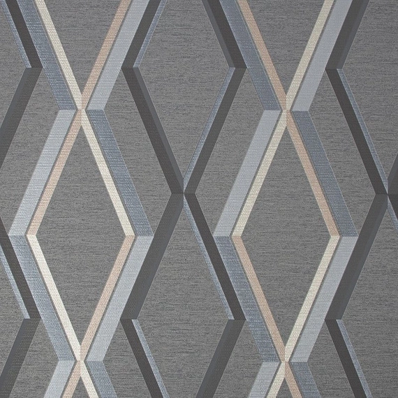 Rolka ma szerokość 53cm, długość 10,05 metra, pasowanie wzoru co 64cm. Piękny geometryczny wzór w duże romby o wielkości 18cm x 30cm w odcieniach modnej szarości na brązowo szarym tle. Prosty wyrazisty wzór z metalicznymi akcentami złota i różowego złota idealnie wpisuje się do współczesnych wnętrz: salonów, sypialni, jadalni, gabinetów, przedpokojów, holi.