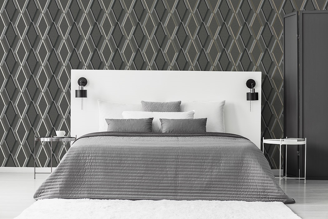 Aranżacja przedstawia tapetę 108611 Diamond Geo Charcoal Prestige Graham & Brown