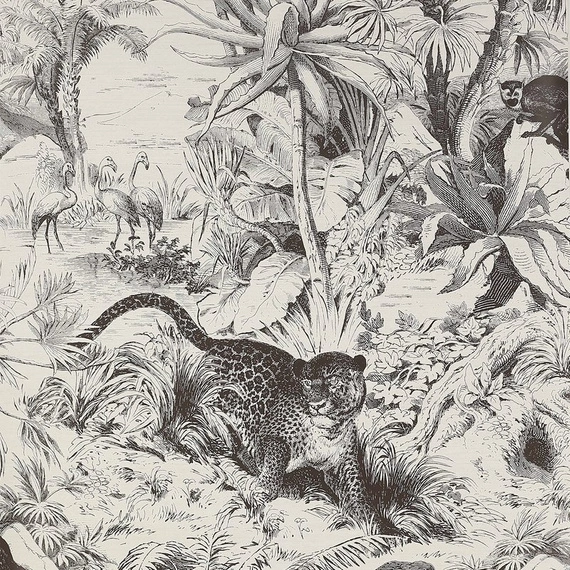 Bujny tropikalny widok z małpami, brodzącymi ptakami i majestatycznym lampartem przemierzającym trawy. Luksusowy monochromatyczny wzór jest tutaj pokazany w kolorze czarnym na białym, dostępne są inne warianty kolorystyczne: