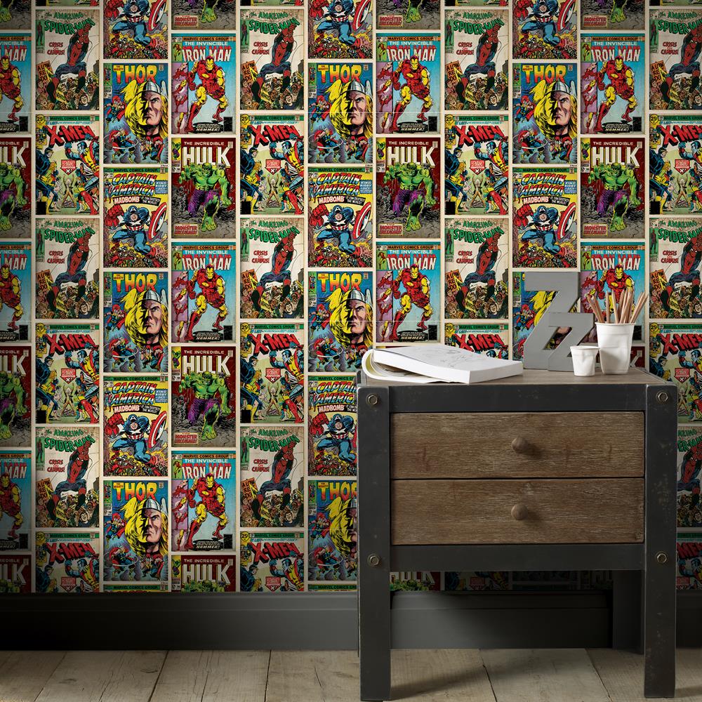 Aranżacja przedstawia tapetę z kolekcji Kids@Home Individual 70-238 Marvel Action Heroes