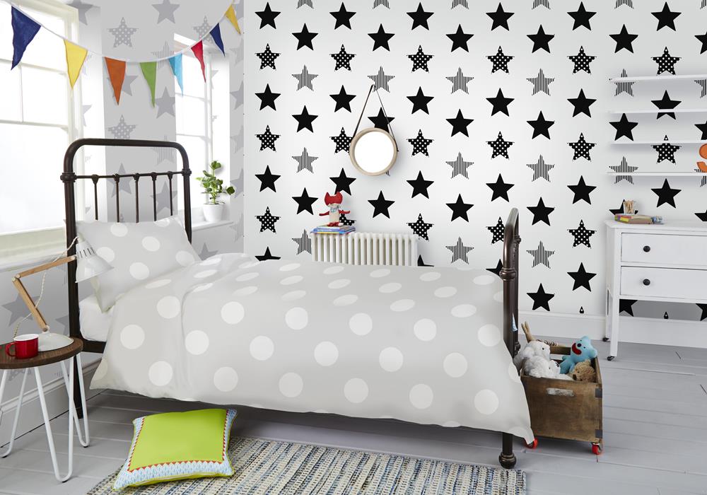 Aranżacja przedstawia tapetę z kolekcji Kids@Home Individual 100110 Superstar Black oraz oraz 100111 Superstar Silver