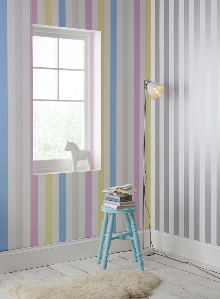 Aranżacja przedstawia tapetę z kolekcji Kids@Home Individual 108557 Navy Stripe