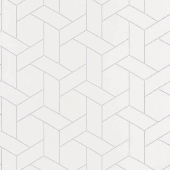 Tapeta na flizelinie, rolka ma szerokość 53cm, długość 10,05 metra, pasowanie wzoru co 16cm. Niesamowita tapeta Z białym, matowym tle, na której srebrne, połyskujące się pasma z małymi kropeczkami tworzą geometryczne figury 3D.