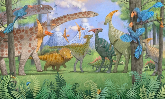 Fototapeta z nowoczesną grafiką, z wyczuwalną w dotyku strukturą, przedstawiająca spacerujące po zielonym lesie dinozaury. W tle nad wulkanami latają prehistoryczne ptaki. Kolorowa fototapeta w pogodnych kolorach, stworzy w pokoju malucha lekką i przytulną atmosferę, będzie doskonałym tłem dla dziecięcego świata zabaw i wyobraźni.
