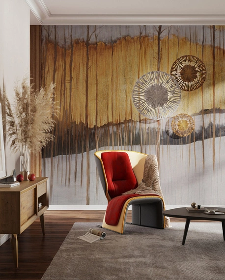 Fototapeta od Wonderwall Studio z nowoczesną grafiką, z wyczuwalną satynową fakturą. Abstrakcyjny zimowy krajobraz z domieszką ciepłych odcieni brązów i koloru żółtego, wnosi do wnętrza dyskretny artyzm i harmonię. Oryginalny autorski projekt, wydrukowany na wysokiej jakości materiałach, będzie wspaniałą ozdobą nowoczesnego pomieszczenia, tworząc w nim niepowtarzalny klimat...