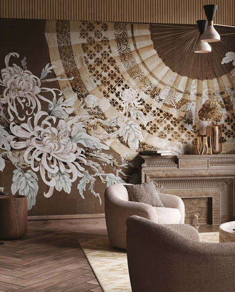 Fototapeta od Wonderwall Studio z nowoczesną grafiką, z wyczuwalną fakturą, z stylizowanym hiszpańskim wachlarzem i finezyjnym kwiatem. Struktura tapety wraz z przenikającymi się wzajemnie kolorami tworzy zachwycający efekt. Oryginalny autorski projekt, wydrukowany na wysokiej jakości materiałach, będzie wspaniałą ozdobą każdego wnętrza, tworząc w nim niepowtarzalny klimat, nikogo nie pozostawi obojętnym....
