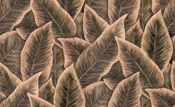Tekstylna tapeta z liśćmi strelicji królewskiej, nazywanej rośliną rajskiego ptaka. Południowoafrykańska roślina charakteryzuje się bujnymi kolorami oraz ciemnozielonymi liśćmi. Ręcznie malowany motyw intryguje swoją prostotą oraz subtelnym wykończeniem w postaci delikatnie połyskującego na złoto, lnianego materiału.