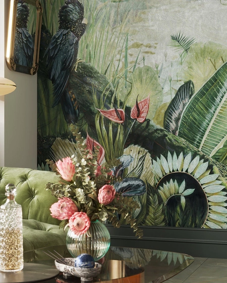 Fototapeta od Wonderwall Studio z nowoczesną grafiką, z wyczuwalną satynową fakturą. Abstrakcyjny wzór zainspirowany tropikalną dżunglą i kolorowymi ptakami. Oryginalny autorski projekt wydrukowany na wysokiej jakości materiałach, będzie wspaniałą ozdobą każdego pomieszczenia, tworząc w nim niepowtarzalny klimat...