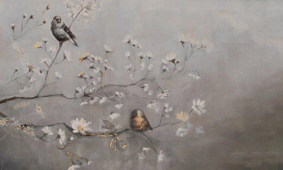 ptaki, ptaszki, drzewo, gałązka, kwiaty, Bugaj, Wallart, oryginalne, malarskie, romantyczne, artystyczne