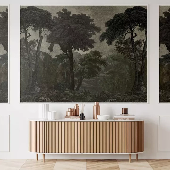 Fototapeta Hood Dark od polskiego producenta firmy Wallart, wprowadzi do wnętrza naturę w niezwykle eleganckim, nieco kolonialnym wydaniu. Widok nawiązujący do starych rycin przedstawia drzewa w otoczeniu bujnej roślinności. Głębokie zielenie będą idealnym uzupełnieniem zarówno drewnianych mebli jak i przełamaniem nowoczesnych szarości. Perspektywa uchwycona w pejzażu sprawi, że wnętrze nabierze głębi i optycznie się powiększy....