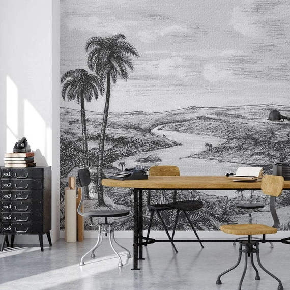 grafika, palmy, rzeka, pustynia, krajobraz, Wallart, oryginalne, artystyczne