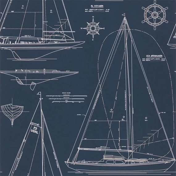 Kolekcja Ralph Lauren Coastal Papers. Wzór Boat Blueprint PRL5035/02 White On Dark Blue