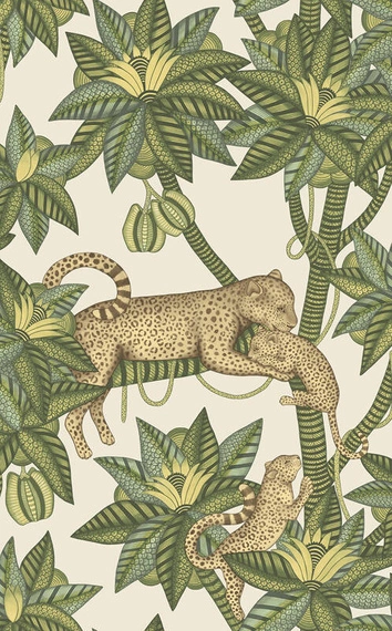 Oryginalna tapeta angielskiej firmy Cole&Son z wzorem Satara przedstawia matkę lamparta wraz z młodymi, które wspinają się na drzewo. Narodowy Park Krugera słynie z wielkich kotów, które w podobnych scenach można zaobserwować w obozie Satara. Dodatkowego uroku tapecie nadają srebrne oraz złote, połyskujące elementy.