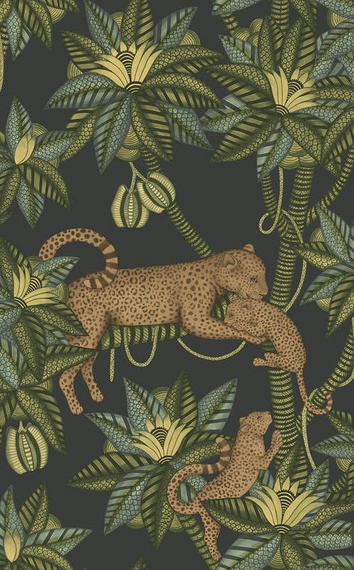 Oryginalna tapeta angielskiej firmy Cole&Son z wzorem Satara przedstawia matkę lamparta wraz z młodymi, które wspinają się na drzewo. Narodowy Park Krugera słynie z wielkich kotów, które w podobnych scenach można zaobserwować w obozie Satara. Dodatkowego uroku tapecie nadają srebrne oraz złote, połyskujące elementy.