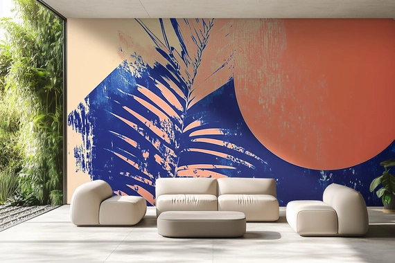 Nowoczesna tapeta z tropikalnym motywem palmy w artystycznym, abstrakcyjnym stylu. Kontrastowe zestawienie głębokiego granatu i ciepłej brzoskwini tworzy efekt retro z nutą nowoczesności. Geometryczny okrąg na tle przecieranej faktury nadaje tapecie dynamiczny i unikalny wygląd. Doskonały wybór do wnętrz w stylu loftowym, nowoczesnym lub eklektycznym, które potrzebują odważnego akcentu.