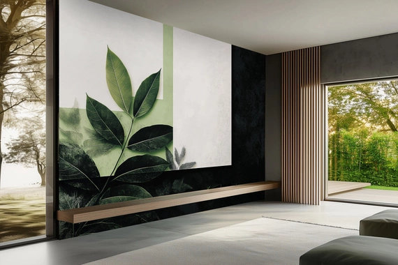 Nowoczesna tapeta łącząca realistyczny motyw roślinny z geometrycznym układem w kontrastowych odcieniach czerni, bieli i zieleni. Subtelne liście wyróżniają się na tle minimalistycznej kompozycji, tworząc harmonijną i stylową dekorację ściany. Przecierane faktury i delikatne cieniowanie dodają głębi, wprowadzając do wnętrza naturalny i elegancki charakter. Idealna do salonu, sypialni lub biura, gdzie podkreśli nowoczesny styl i doda wnętrzu świeżości.