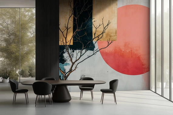 Nowoczesna tapeta artystyczna łącząca geometryczne formy z organicznymi elementami natury. Kompozycja złotych prostokątów, intensywnego czerwonego okręgu oraz delikatnych, nagich gałęzi tworzy efekt głębi i harmonii. Przetarte faktury i kontrastujące barwy nadają wnętrzu wyjątkowy, abstrakcyjny charakter. Idealna do nowoczesnych przestrzeni, salonów i biur, gdzie wprowadzi artystyczny i elegancki akcent.