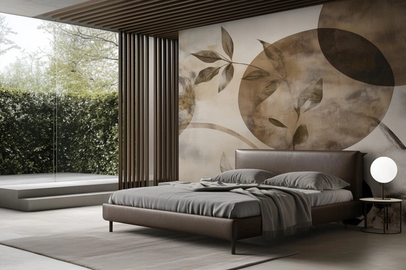 Elegancka tapeta artystyczna w odcieniach beżu i brązu, łącząca subtelne motywy botaniczne z geometrycznymi kształtami. Przezroczyste, przecierane okręgi nadają kompozycji lekkości, a delikatne liście wprowadzają naturalny akcent. Malarska faktura i stonowana kolorystyka sprawiają, że tapeta doskonale komponuje się z wnętrzami w stylu klasycznym, boho i nowoczesnym. Idealna do salonu, sypialni czy przestrzeni biurowej, tworząc harmonijną i wyrafinowaną atmosferę.