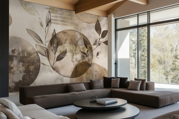Tapeta o ciepłej, ziemistej kolorystyce łącząca subtelne motywy roślinne z abstrakcyjnymi okręgami. Delikatne linie liści i gałęzi przeplatają się z przecieranym tłem, tworząc efekt głębi i elegancji. Beżowe, brązowe i sepia-tony nadają wnętrzu przytulny, a zarazem luksusowy charakter. Idealna do nowoczesnych i klasycznych aranżacji, świetnie komponuje się z naturalnymi materiałami.