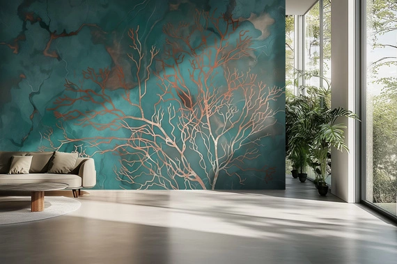 Elegancka tapeta inspirowana naturą, przedstawiająca subtelne, złociste koralowce na tle głębokiego turkusu. Efekt akwarelowego rozmycia nadaje jej artystycznego charakteru, a miedziane i złote akcenty dodają luksusowego wyglądu. Świetnie sprawdzi się w nowoczesnych wnętrzach, tworząc atmosferę spokoju i głębi.
