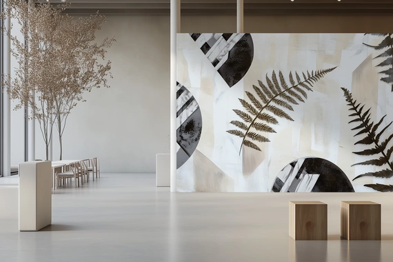 Stylowa tapeta z motywem paproci w eleganckiej, monochromatycznej palecie barw. Czarne, delikatne liście kontrastują z jasnym, kremowym tłem, na którym pojawiają się subtelne geometryczne kształty. Połączenie natury i abstrakcyjnych form nadaje kompozycji nowoczesny, artystyczny charakter.