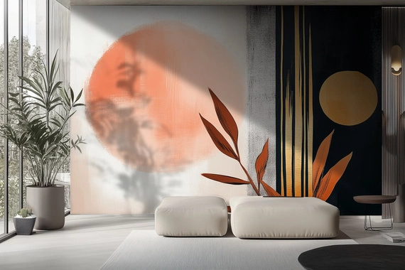 Nowoczesna tapeta inspirowana sztuką abstrakcyjną i naturą, łącząca ciepłe odcienie terakoty, złota i czerni. Duże geometryczne formy przypominające słońce oraz smukłe złote linie dodają jej wyrafinowanego, minimalistycznego charakteru. Delikatne liście w ciepłej kolorystyce podkreślają organiczny aspekt wzoru.