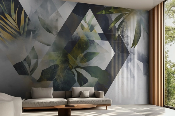 Elegancka tapeta łącząca geometryczne wzory z organicznymi motywami roślinnymi. Przenikające się trójkąty i gradientowe przejścia kolorystyczne tworzą efekt głębi, podczas gdy subtelne liście w odcieniach zieleni i złota nadają kompozycji naturalny charakter.