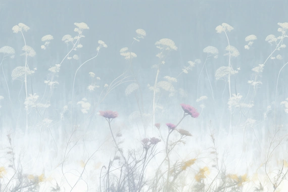 Ten mural to jak oddech wiosennej bryzy, gdzie delikatne, błękitne tło sprawia, że cała scena wydaje się unosić w powietrzu. Kwiaty polnych łąk tańczą na płótnie w delikatnych odcieniach różu, fioletu i bieli, jakby malowane pociągnięciem lekkiej ręki. Ich płatki unoszą się na wietrze, tworząc subtelny taniec natury. To jak obraz, w którym każdy detal jest uchwycony z najwyższą precyzją, a kolory przenoszą nas w krainę spokoju i ukojenia. Patrząc na ten mural, można poczuć, jakby się przeniosło w malowniczy ogród, gdzie wiosna trwa wiecznie, a kwiaty tańczą w rytm przyjemnego szmeru natury.