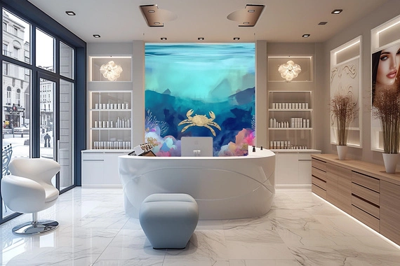 Morskie głębiny ożywają w spektaklu kolorów i światła. Złoty krab, którego faktura przypomina piasek na plaży, wydaje się być panem tego podwodnego królestwa, unosząc się tuż nad różnorodnymi koralowcami. Te ostatnie są namalowane w pastelowej palecie barw, od delikatnych różów po żywe fiolety i błękity, co nadaje scenie niemal oniryczny charakter. Powierzchnia wody, malowana szerokimi pociągnięciami pędzla, odbija łagodne, zmienne odcienie zachodzącego słońca, tworząc spokojną, ale dynamiczną górną granicę obrazu. Delikatne gradacje światła i cienia pod wodą dodają głębi i tajemniczości, pozwalając widzowi zatopić się w tej podwodnej fantazji.