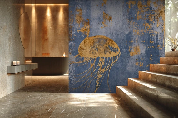 Meduza, której sylwetka wyłania się z tła o bogatej teksturze. Złociste linie jej macek kontrastują z głębokim, desaturacyjnym niebieskim tłem, nadając kompozycji elegancję i dynamizm. Patyny i zacieki w odcieniach złota dodają dziełu charakteru antycznego, jakby to była scena uwieczniona na starożytnej ścianie czy w zatopionym skarbcu. Złote akcenty nie tylko akcentują delikatną formę meduzy, ale również wprowadzają elementy abstrakcyjne, które wzmagają tajemniczość i głębię przedstawienia. Wzór jest jednocześnie prosty i złożony, łącząc naturalistyczny obiekt z abstrakcyjnym wykonaniem, co pozwala na wielowarstwową interpretację.
