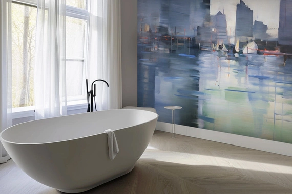 Tapeta pełna impresjonistycznych pociągnięć i rozmytych obrazów, ukazuje miejską panoramę z widokiem na wodę, w której odbijają się światła i sylwetki budynków. Subtelne pociągnięcia pędzla tworzą wrażenie spokojnego ruchu wody, wprowadzając element relaksu i spokoju do tej przestrzeni. Błękity, szarości i akcenty cieplejszych barw, kontrastują, nadając głębię i artystyczny charakter.