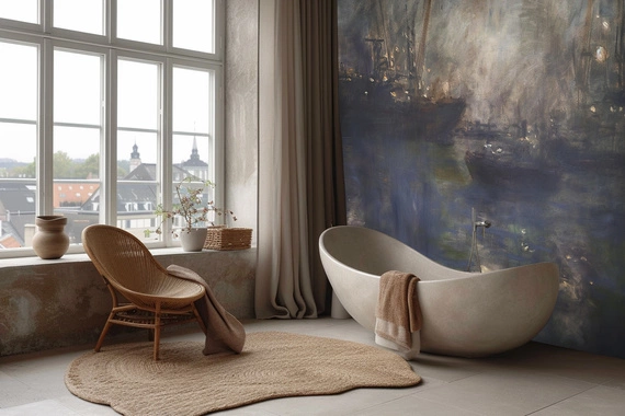 Mural przenosi nas do portowego miasta o zmierzchu, gdy ostatnie promienie dnia odbijają się w spokojnych wodach doków. Scena jest zanurzona w miękkim świetle, które rzuca cienie na sylwetki statków i łodzi dryfujących na wodzie, nadając im tajemniczego uroku. Niebo i woda stapiają się w jedność dzięki subtelnym odcieniom szarości i błękitu, przez co trudno jest odróżnić horyzont. Światła portu migocą jak gwiazdy, rozświetlając noc i rzucając złociste refleksy na powierzchnię wody. Przemyślana gra światła i cienia dodaje obrazowi głębi i atmosfery, a postacie statków są ledwie zarysowane, co pozwala widzowi na własną interpretację sceny. To dzieło, z jego eterycznym nastrojem i impresjonistycznym urokiem, jest jak poetycka wizja, która oddaje spokój i urok zmierzchającego dnia.