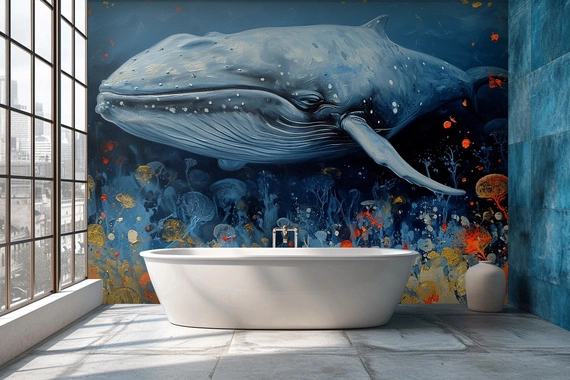 Majestatyczny wieloryb, płynący w głębiach oceanu wśród roztańczonych meduz. Ta ogromna morska istota, uwieczniona z olbrzymią dbałością o szczegół, wydaje się płynąć w bezkresnym, niebieskim morzu. Wokół niego, jak kosmiczne galaktyki, wirują złote i czerwone meduzy, które przypominają gwiaździste niebo pełne życia. Kontrastujące kolory meduz przeciwko głębokiemu błękitowi morskich głębin tworzą wrażenie niezgłębionej głębi i tajemniczości oceanu. Wieloryb z jego spokojnym i majestatycznym wyrazem twarzy symbolizuje siłę natury i jej spokojną elegancję. Mural, pełen dynamiki i koloru, jest zarówno hołdem dla oceanicznej fauny, jak i przypomnieniem o jej kruchej piękności.