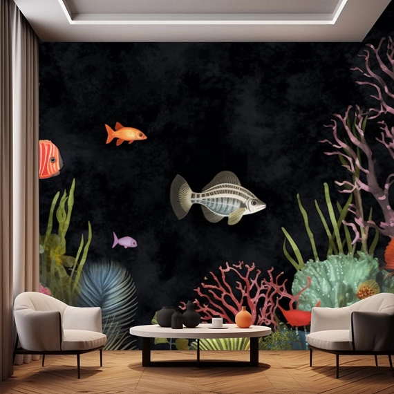 Podwodny pejzaż, w którym królują rafy koralowe i roślinność morska. Zróżnicowane kształty i barwy koralowców, od delikatnych różów po intensywne czerwienie, tworzą tło dla gracji pływających ryb. Każda ryba, z jej unikalnym wzorem i kolorystyką, przyczynia się do witalności i ruchu sceny. Kontrast między ciemnym tłem a żywymi barwami fauny i flory morskiej podkreśla bogactwo i różnorodność życia w oceanie. Ta kompozycja jest niczym spokojna symfonia natury, gdzie każdy element, choć indywidualny, przyczynia się do harmonii całości. Obraz przypomina nam o ukrytym świecie pod powierzchnią morza, pełnym piękna i tajemnicy, które czekają na odkrycie.