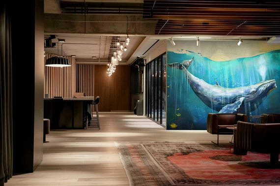 Monumentalny wieloryb, który zajmuje centralne miejsce w kompozycji, unosząc się w krystalicznych głębinach oceanu. Jego ciało, z delikatnymi cieniami i odbłyskami światła, sprawia wrażenie pulsującego życiem. Otoczenie wieloryba jest żywe kolorami, z żółtymi rybkami, które dodają dynamizmu scenie i kontrastują z błękitno-turkusową tonacją wody. W tle, powierzchnia wody zarysowana jest na granicy dwóch światów, morskiej powierzchni. To dzieło sztuki balansuje pomiędzy realizmem a abstrakcją, przyciągając uwagę do majestatyczności i spokoju morskich olbrzymów, jednocześnie zachęcając do refleksji nad ich tajemniczym życiem w głębinach oceanu.