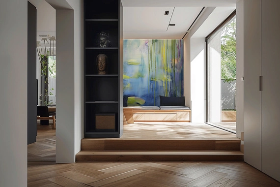 Artystyczna interpretacja stawu z liliami wodnymi, przedstawioną w stylu eklektycznym, łączącym elementy realistyczne z abstrakcją. Lśniące płatki lilii wodnych delikatnie unoszą się na powierzchni wody, stanowiąc oazę spokoju i naturalnego piękna. Dynamiczne smugi kolorów, od żółci po róż i zieleń, rozmieszczone są na płótnie w sposób, który nadaje obrazowi ruch i życie. Tło muralu to bogactwo tekstur i warstw, z subtelnie prześwitującymi przez nie światłem i cieniem, co tworzy wrażenie głębi i przestrzeni. Ta malarska kompozycja zachęca do zatrzymania się i kontemplacji, przypominając o spokojnym rytmie natury.