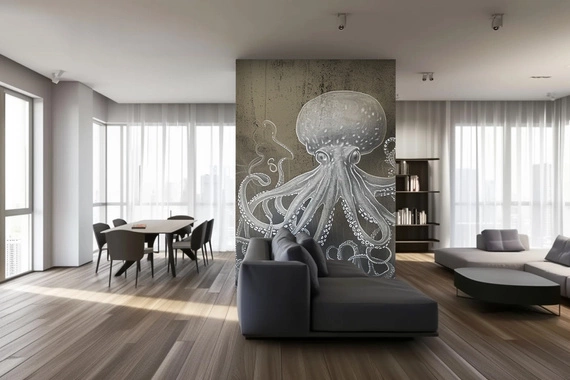 Ośmiornica, której postać wyłania się z tajemniczego, monochromatycznego tła. Jej białe, przejrzyste kontury z subtelnymi akcentami, które imitują delikatność i teksturę prawdziwych macek, nadają tej stworze morskiej eteryczny i niemal mistyczny wygląd. Tło obrazu, z jego neutralnymi beżami i szarościami, pełne jest faktur i warstw, które tworzą wrażenie antycznej powierzchni, może ściany z epoki, na której czas pozostawił swoje ślady. Wielowymiarowość stworzenia w kontraście do surowego tła nadaje dziełu głębokiego, prawie trójwymiarowego efektu. Mural jest jednocześnie spokojny i złożony, gdzie każdy element, choć subtelny, wnosi do kompozycji swój unikalny charakter.